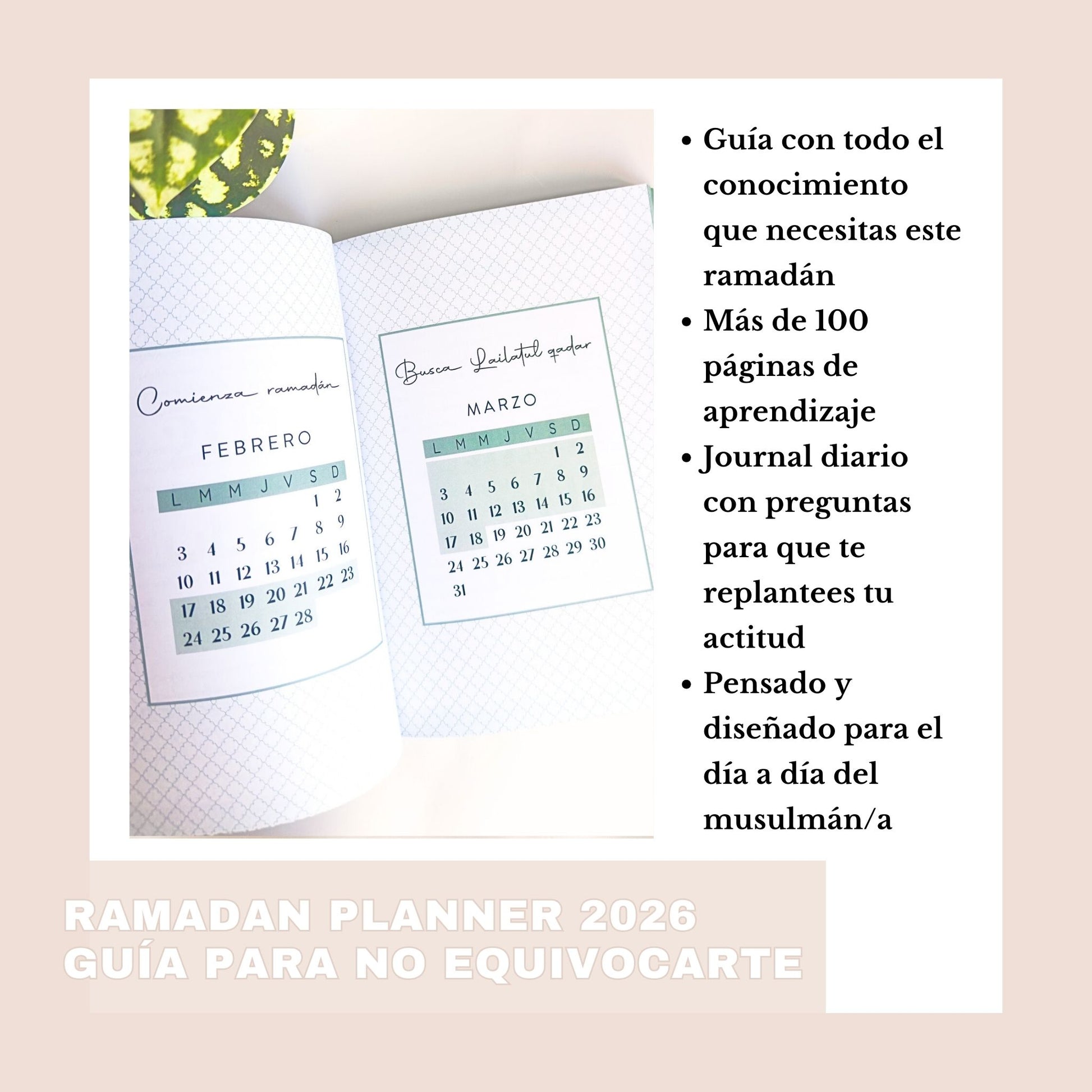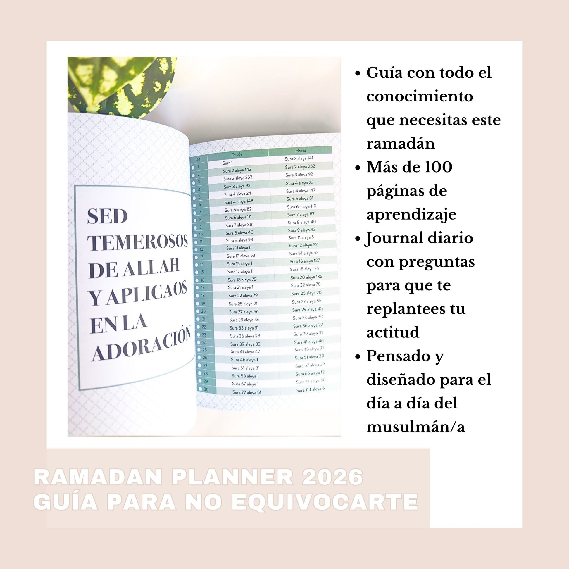 Este planner incluye tafsir y reflexiones coránicas, explicadas de forma accesible, para que no solo recites, sino que entiendas, medites y apliques el mensaje del Qur’an durante el mes de ramadán.